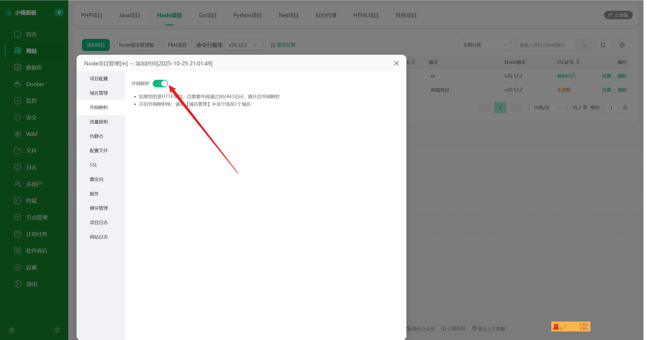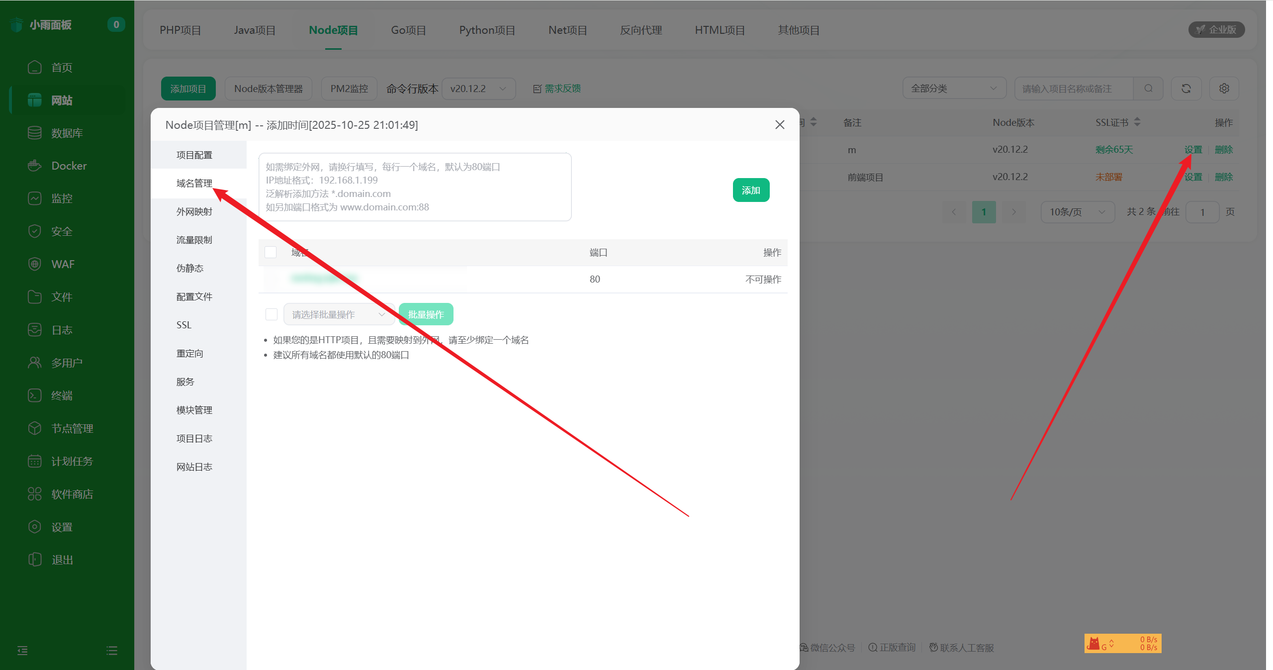 添加访问域名和开启SSL,此处域名需和第二步骤中.env文件METING_URL 的域名保持一致!