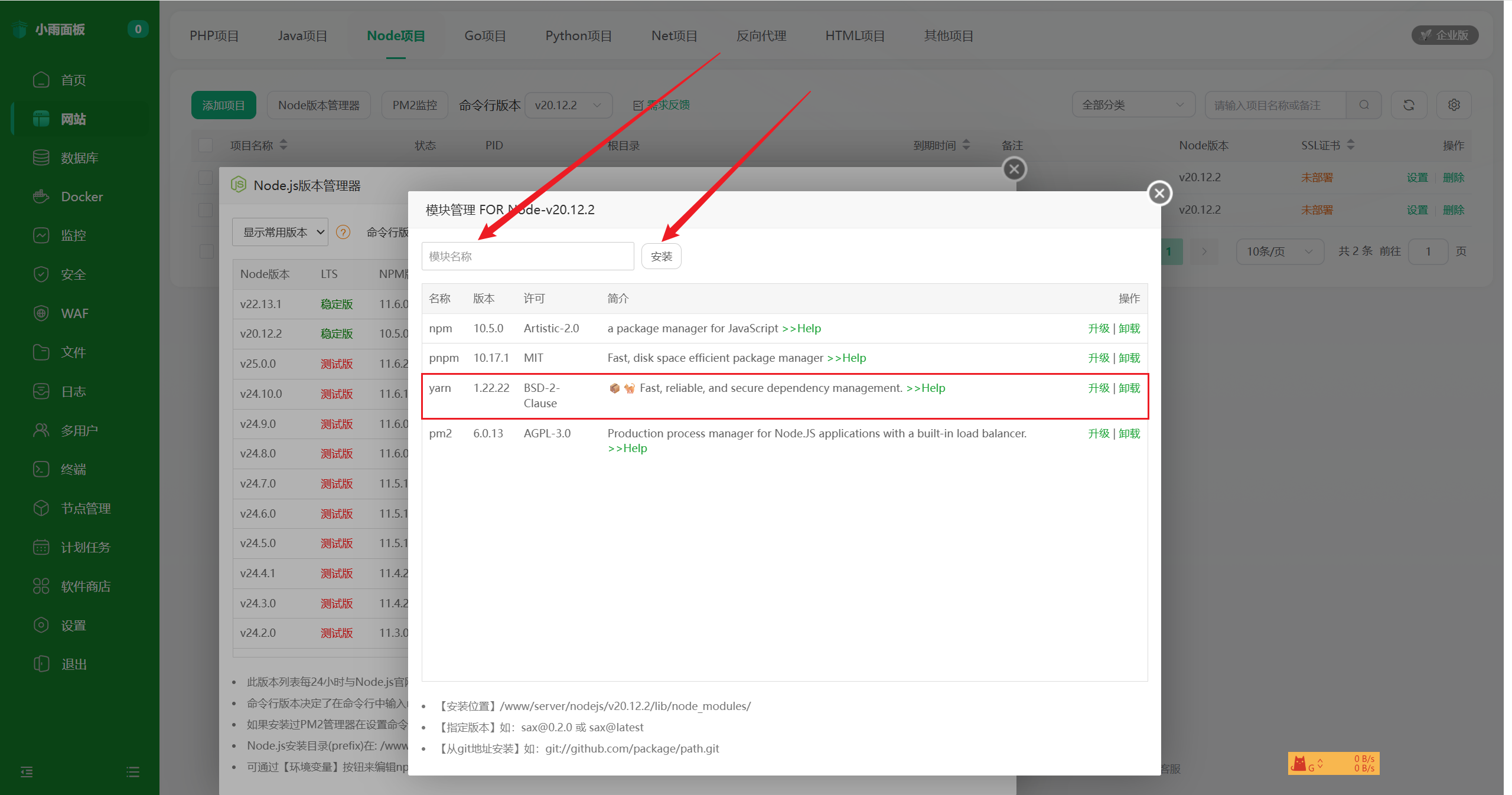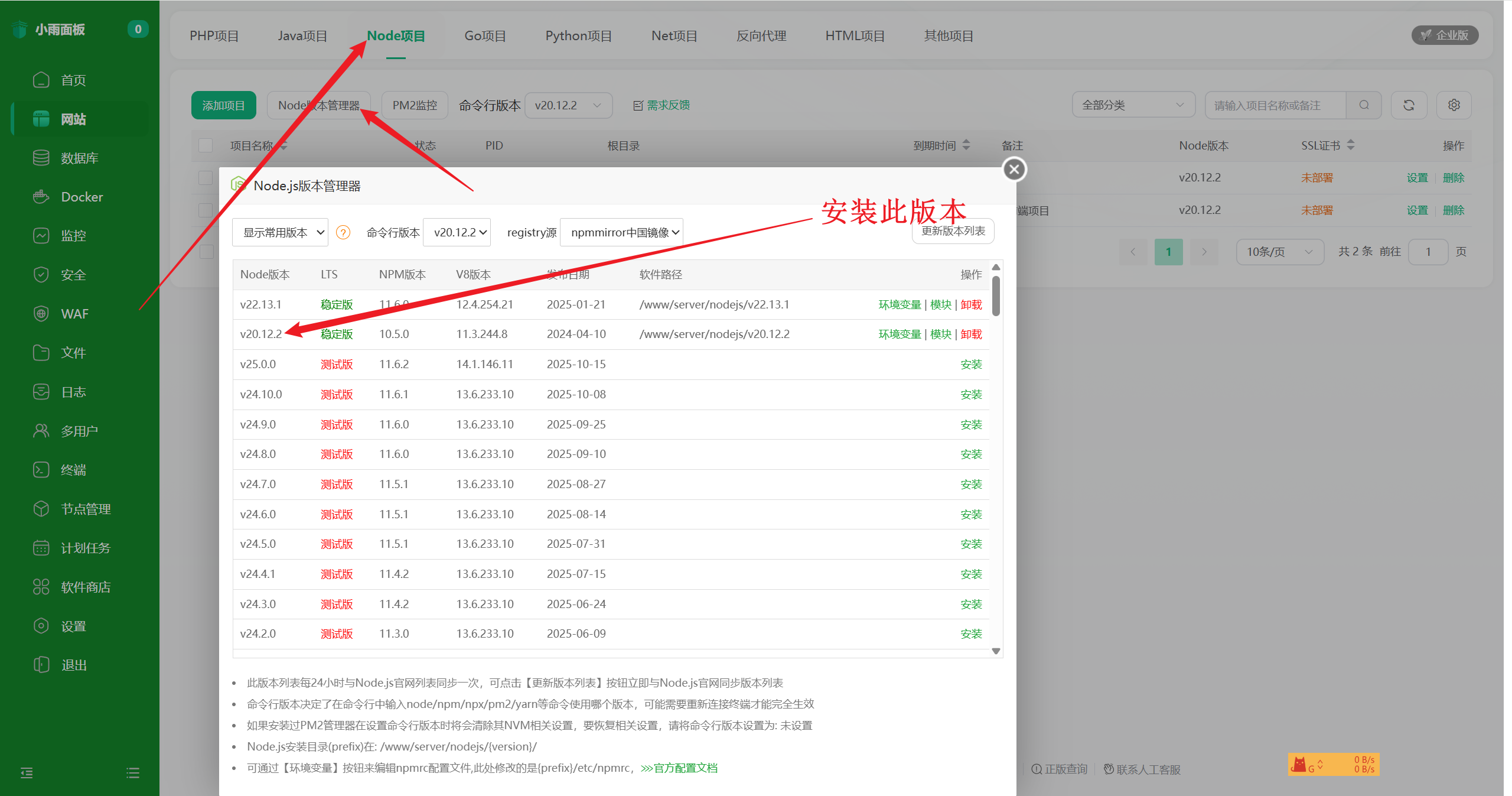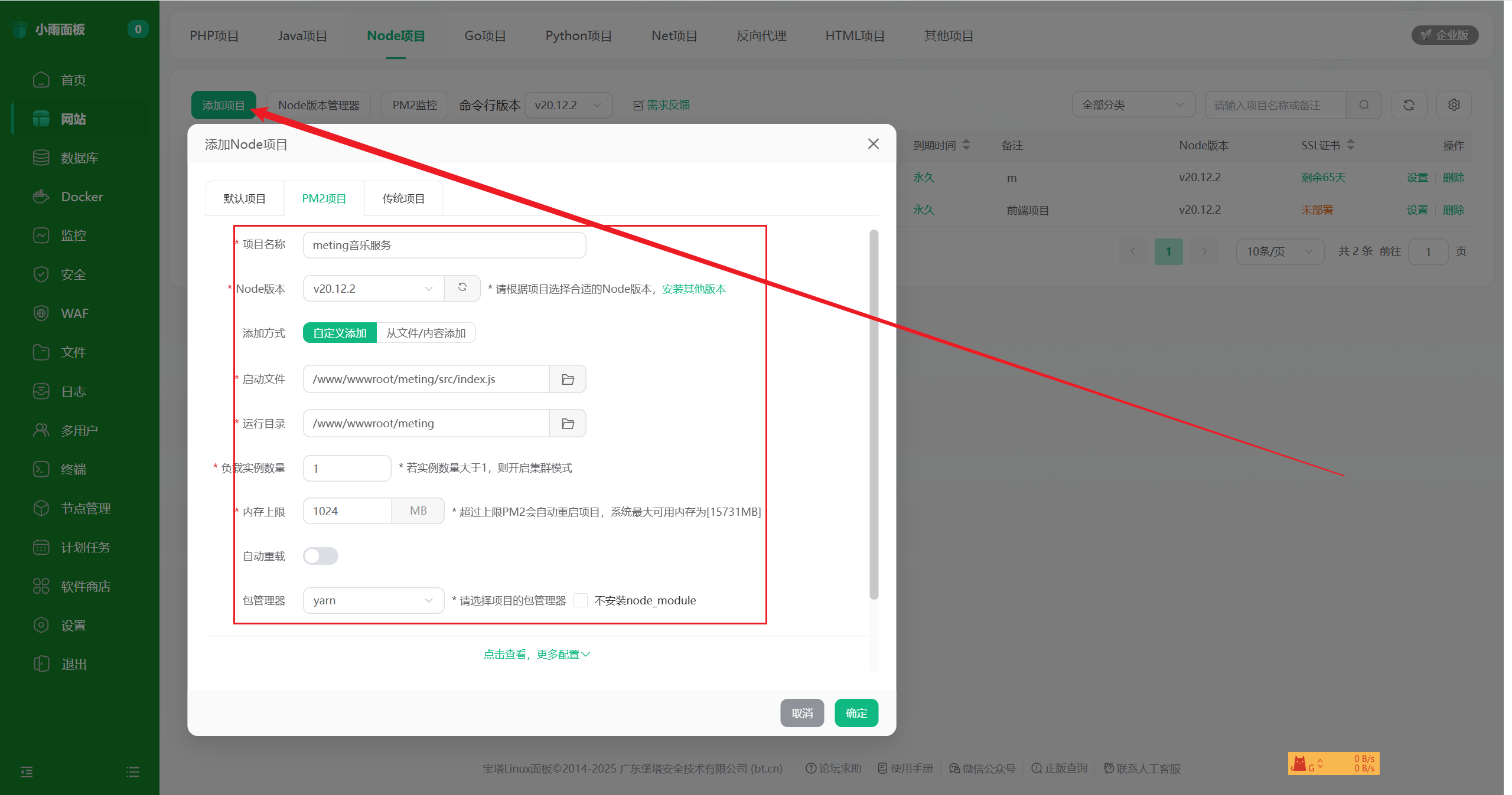 添加Node项目,选择pm2项目,照着图中填写即可,启动文件和运行目录需修改为自己实际的地址,点击确定等待项目部署成功即可。